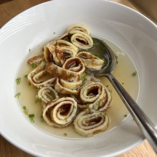 As a chef who’s spent years cooking German cuisine, Flädlesuppe, or German pancake soup is a simple comforting dish that I keep in my repertoire. It’s a dish that perfectly showcases how simple ingredients can come together to create something deeply satisfying. Thin strips of savory pancakes floating in a rich chicken broth—it’s a straightforward recipe, but it delivers big on flavor and comfort. Although it is served in many restaurants, it’s not one that we served where I worked very often. Maybe I never thought Americans would understand it – it’s a shame because anyone who has tried it usually loves it.